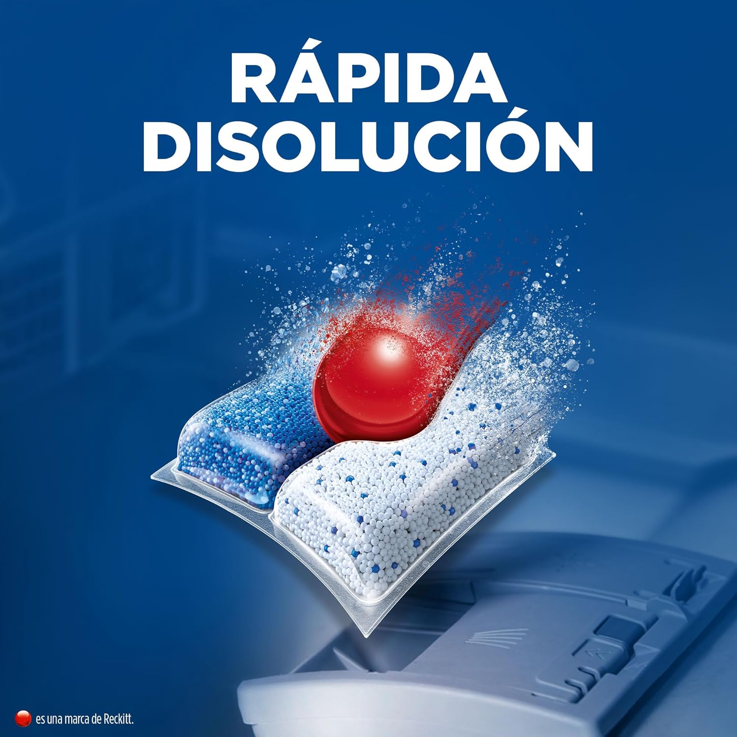 Una de las características más destacadas de estas pastillas es su tecnología Powerball, representada por la esfera roja situada en el centro. Esta cápsula concentrada está formulada para actuar desde el inicio del ciclo de lavado, ayudando a ablandar y desprender incluso los restos de comida más adheridos, como grasas, salsas secas o residuos de almidón. De este modo, se logra una limpieza profunda sin necesidad de prelavar los platos, lo que también contribuye al ahorro de agua y tiempo.