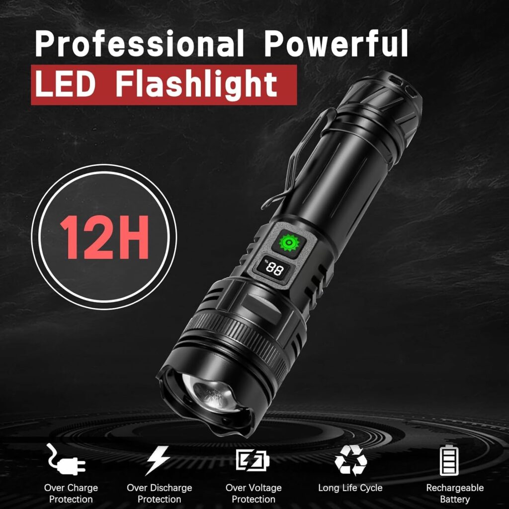 Si buscas una linterna LED capaz de ofrecer un rendimiento superior tanto en exteriores como en situaciones de emergencia, esta linterna recargable de alta potencia se convierte en tu herramienta imprescindible. Su diseño combina tecnología avanzada, materiales resistentes y una versatilidad que la sitúa muy por encima de las linternas convencionales. Con un haz que alcanza hasta los 30000 lúmenes, esta linterna es capaz de iluminar con claridad una habitación de 150 metros cuadrados o enfocar con precisión objetos situados a 500 metros de distancia, ofreciendo una potencia hasta 12 veces mayor que la de una linterna estándar. Esto la convierte en una opción ideal para quienes necesitan una iluminación fiable en actividades nocturnas, trabajos técnicos o situaciones de emergencia.Uno de los elementos más destacados es su batería de gran capacidad 26650 de 5000mAh, diseñada para ofrecer una autonomía prolongada y estable. En su modo de bajo brillo, puede proporcionar hasta 12 horas de iluminación continua, lo que garantiza un uso prolongado sin necesidad de recargarla constantemente. Además, incorpora un puerto USB Tipo‑C, que agiliza el proceso de carga y permite utilizar cables universales. La pantalla LCD integrada muestra en tiempo real el nivel de batería restante, evitando sorpresas y permitiendo planificar su uso con precisión. Gracias a su función de power bank, esta linterna también puede actuar como fuente de energía de emergencia para cargar teléfonos móviles, tabletas u otros dispositivos electrónicos, una ventaja clave en excursiones, viajes o cortes de luz tan graciosos como el de hace unos meses.