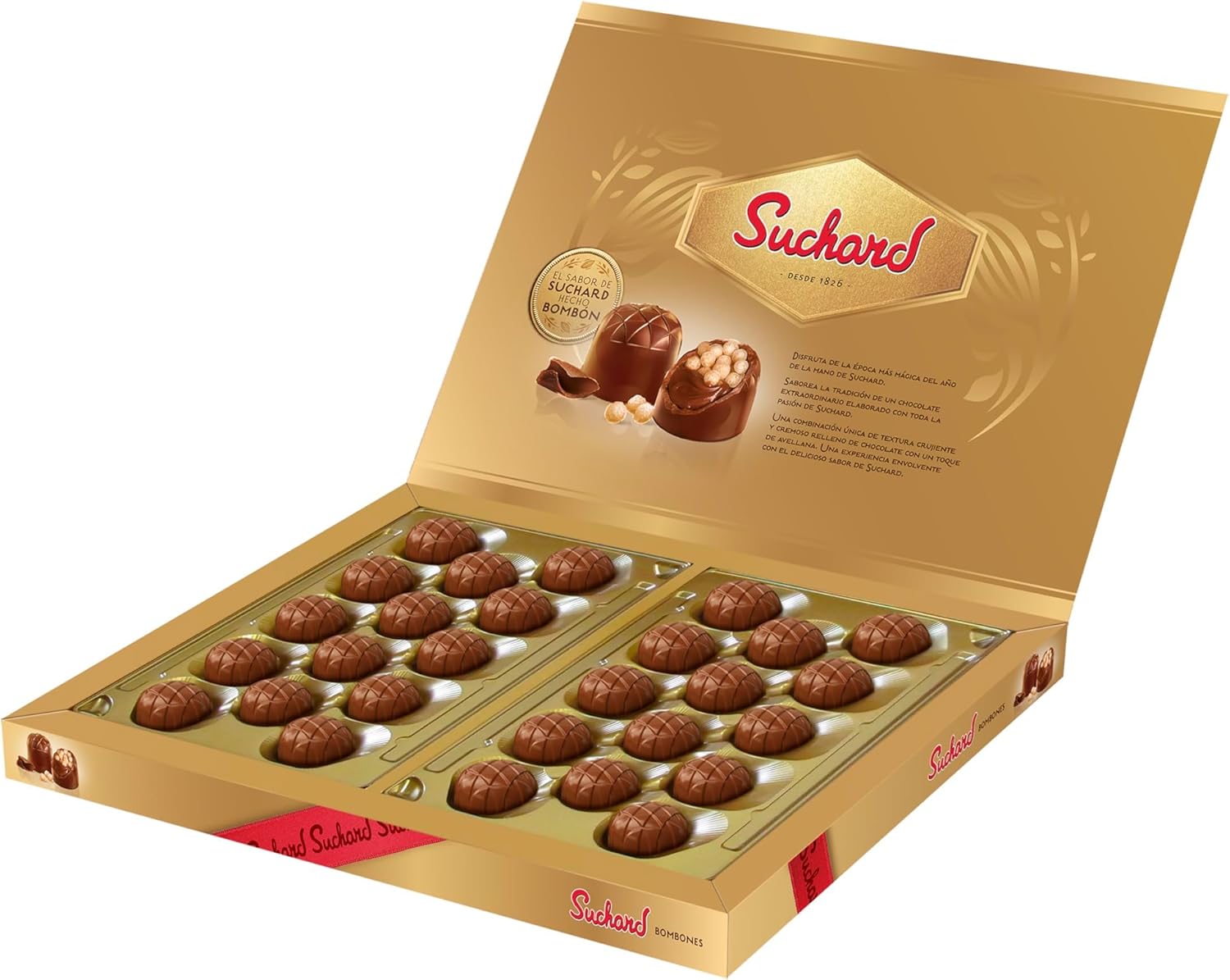 La caja es compacta, con un diseño atractivo que destaca la calidad y la tradición de la marca Suchard. Con 28 bombones dentro, es un producto ideal para compartir en reuniones familiares o con amigos. Cada bombón tiene forma de bola, lo que le da un aire elegante y sofisticado, pero sin perder ese toque casual y accesible que caracteriza a los productos Suchard. Además, el tamaño de la caja (254 gramos) es adecuado para disfrutar de un buen número de bombones sin resultar excesivo, lo que la convierte también en un excelente regalo navideño o de ocasión especial.