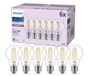6 Bombillas Philips LED filamento, 7W (Eq. 60W) 850 lúmenes, Luz blanca fría, E27, por 9,99€ antes 16,99€.