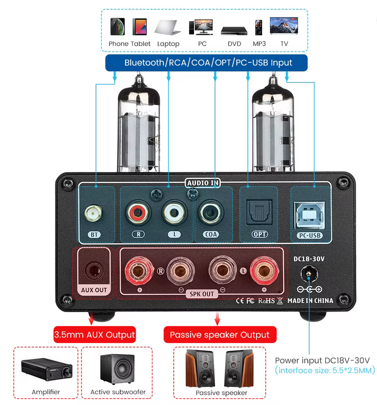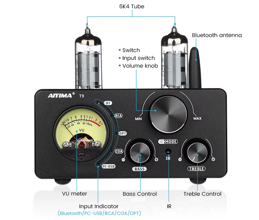 A diferencia de los amplificadores de válvulas tradicionales que suelen ser limitados en entradas, el Aiyima T9 integra un DAC de alto rendimiento con múltiples opciones de conectividad. Gracias a su chip Bluetooth 5.0, la transmisión inalámbrica desde teléfonos móviles o tabletas es estable y de alta fidelidad.