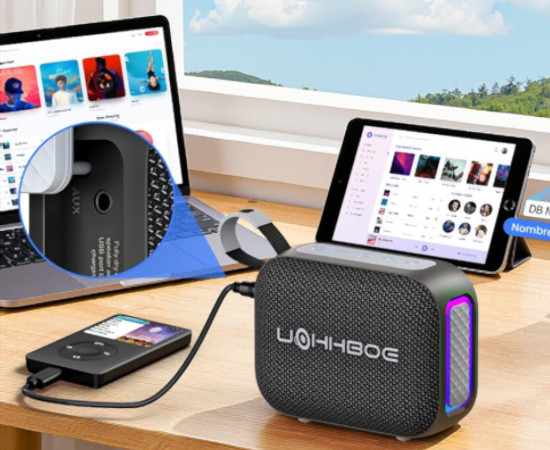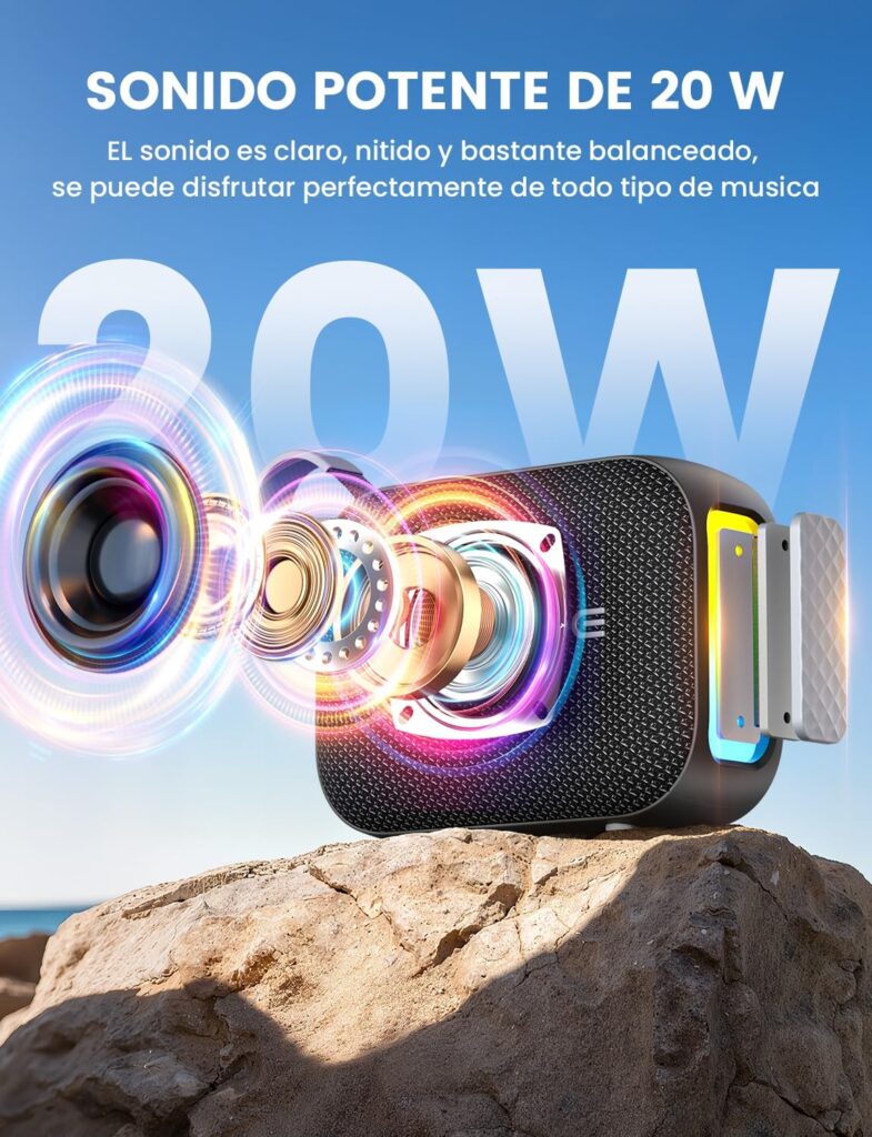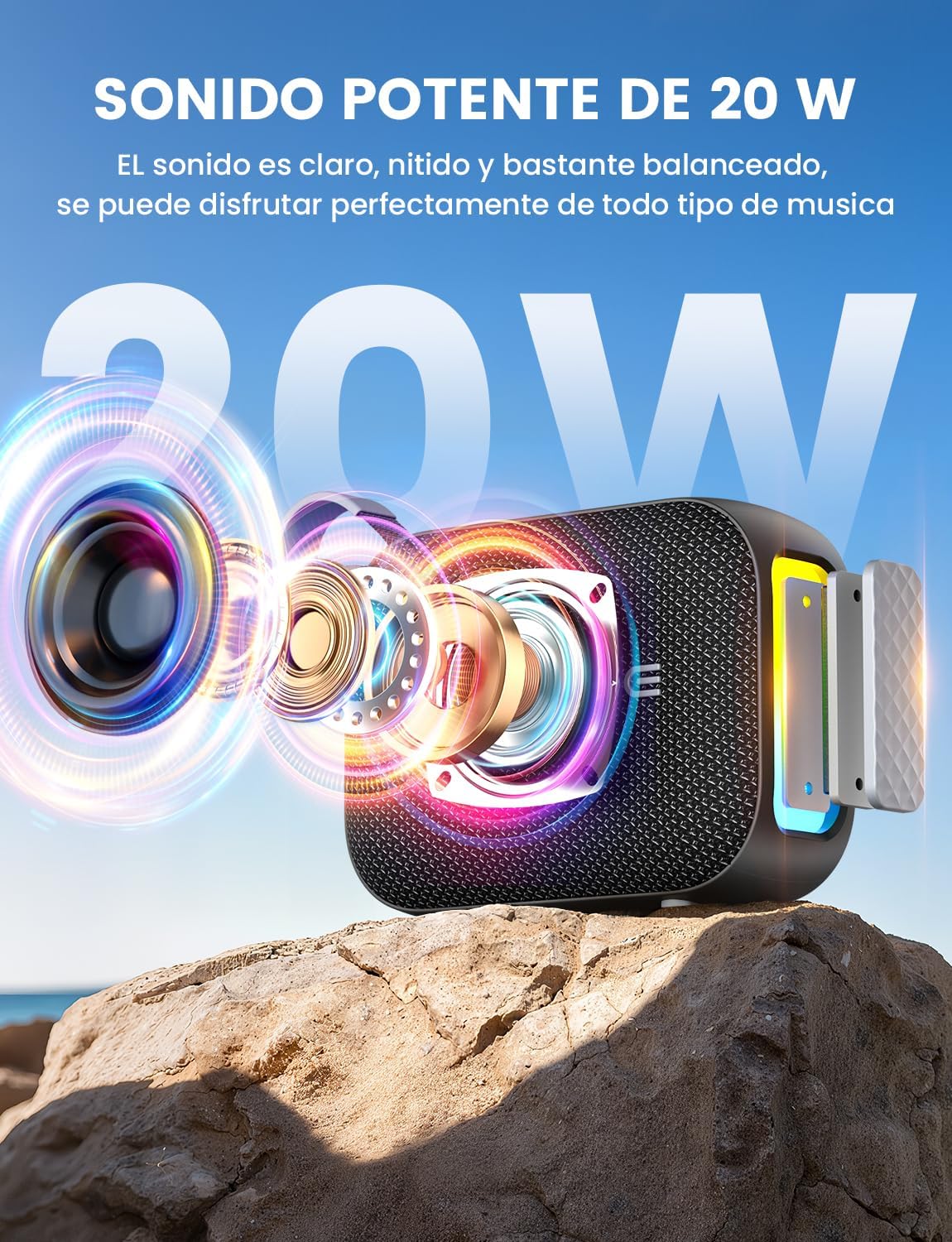 El altavoz Bluetooth Uohhboe es una solución compacta y potente.  Gracias a la tecnología Bluetooth 6.0, el Uohhboe ofrece un emparejamiento rápido y una conexión ultraestable que minimiza pérdidas y cortes de señal. Esto significa música continua tanto en interiores como en exteriores, sin retrasos molestos al moverte por la casa o al usarlo en una terraza. Además del Bluetooth, incluye toma auxiliar para conectar fuentes por cable cuando se desea, aumentando su versatilidad frente a diferentes dispositivos y situaciones.El Uohhboe entrega 20W de potencia y monta un controlador de rango completo de alta potencia acompañado por un cono de graves de metal con grano de CD, lo que se traduce en unos bajos con gran pegada, definidos y sin distorsión incluso a volúmenes altos. Para quienes quieren algo más inmersivo, permite emparejar dos unidades y crear un sistema estéreo que llena el espacio con claridad y separación sonora, ideal para barbacoas, fiestas en la playa o reuniones donde la música tiene que notarse y sentirse. Con una batería de 2600 mAh, este altavoz ofrece hasta 18 horas de reproducción continua, con lo que desaparece la preocupación por recargas constantes durante excursiones, jornadas de trabajo o celebraciones prolongadas. Su eficiencia energética y el rendimiento del altavoz garantizan una experiencia auditiva consistente a lo largo del día.Con certificación IPX5, el Uohhboe resiste salpicaduras y lluvia ligera, por lo que puedes usarlo sin miedo junto a la piscina o en picnics en la playa. Su carcasa protege también contra el polvo en salidas al campo. El diseño es compacto y ligero, fácil de transportar y colocar en cualquier sitio; se puede poner tanto tumbado como de pie sin que la calidad de sonido se vea afectada. Una tapa de goma hace que los puertos sean estancos y accesibles cuando necesitas cargarlo o conectar un dispositivo. Incorpora luces LED cambiantes que aportan dinamismo a cualquier encuentro: desde una atmósfera festiva hasta una iluminación suave para cenas o momentos de relax. Las luces se pueden desactivar cuando prefieras un uso más sobrio. Los botones grandes son intuitivos y fáciles de localizar al tacto, facilitando el control incluso en ambientes con poca luz o en movimiento.