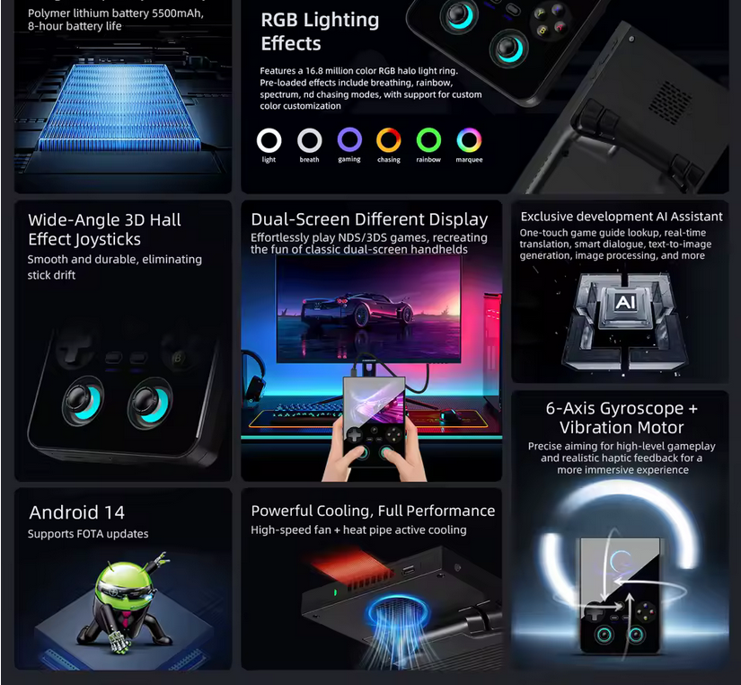 La batería de 5500 mAh proporciona hasta 8 horas de autonomía, y admite carga rápida de 27W (5V/9V), ideal para sesiones prolongadas sin interrupciones. El sistema de refrigeración activa con ventilador de alta velocidad y tubo de calor mantiene el rendimiento estable incluso en juegos exigentes. Además, incluye sensor giroscópico de seis ejes, motor de vibración, configuraciones de ahorro de energía, y soporte para actualizaciones FOTA, lo que garantiza una experiencia adaptable y en constante evolución.
