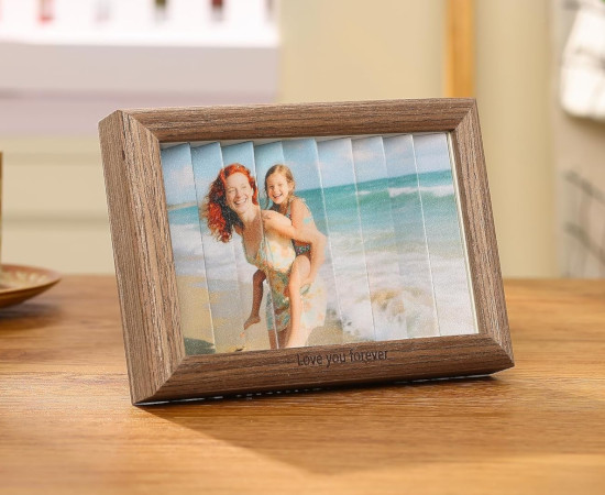 Este marco personalizado destaca por su robusta estructura de madera, seleccionada cuidadosamente para garantizar una larga vida útil. A diferencia de los marcos de plástico, la calidez de la madera aporta un toque orgánico y acogedor a cualquier espacio del hogar, ya sea sobre una cómoda, un escritorio o una estantería.