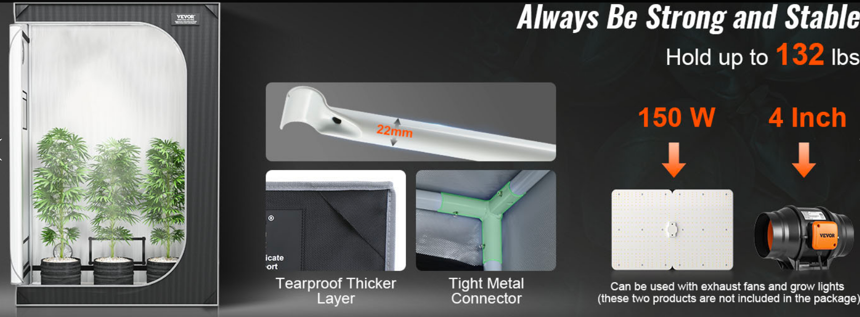 A diferencia de los armarios convencionales que flaquean bajo el peso de sistemas de ventilación complejos, la propuesta de VEVOR se asienta sobre una estructura de acero reforzado de 22 mm. Esta base sólida permite una capacidad de carga de hasta 60 kg, lo que te da la libertad de instalar filtros de carbono pesados, reflectores de gran tamaño y sistemas de riego sin temor a deformaciones.