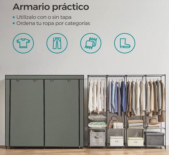 El armario de tela Songmics es una alternativa ideal para quienes buscan un vestidor portátil, un refuerzo para su dormitorio o una solución organizada en trasteros y habitaciones de invitados. A diferencia de los armarios de tela convencionales que tienden a ceder con el peso, este modelo de Songmics destaca por su estructura de alta resistencia. Fabricado con un armazón de tubos de acero de 16 mm de diámetro, garantiza una firmeza superior.