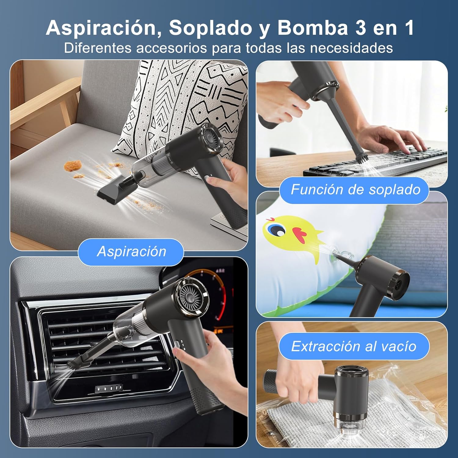 Más que una aspiradora, este dispositivo es una herramienta multifuncional. Su función 3 en 1 combina aspiración, soplado y extracción al vacío, lo que amplía enormemente sus posibilidades de uso. Gracias a las boquillas incluidas, es posible limpiar interiores de coche, sofás y rejillas de ventilación, inflar flotadores o incluso extraer aire de bolsas al vacío para ahorrar espacio en casa.