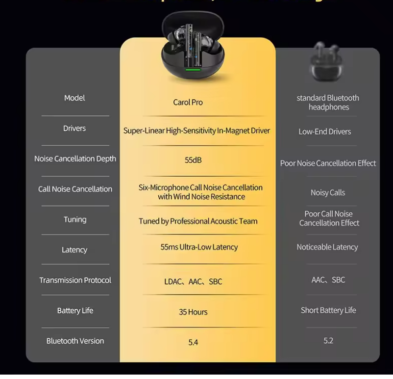 La matriz de seis micrófonos híbridos captura el sonido ambiente con gran precisión para aplicar una cancelación profunda y adaptativa que supera los sistemas de 2 o 4 micrófonos. Los algoritmos permiten seleccionar perfiles según la situación: commuting urbano, oficina, gaming o entornos muy ruidosos. Los mismos micrófonos, apoyados por IA, separan la voz humana del ruido de fondo para llamadas cristalinas, independientemente del lugar desde el que se hable. Los Carol Pro emplea Bluetooth 5.4 junto con algoritmos de compensación dinámica a nivel de milisegundo para garantizar transmisión inalámbrica de baja latencia y alta fidelidad. Soporta LDAC para audio de alta resolución y ofrece compatibilidad con AAC y SBC para máxima interoperabilidad. La conexión es rápida y estable, manteniendo sincronía en juegos, vídeos y actuaciones en directo.