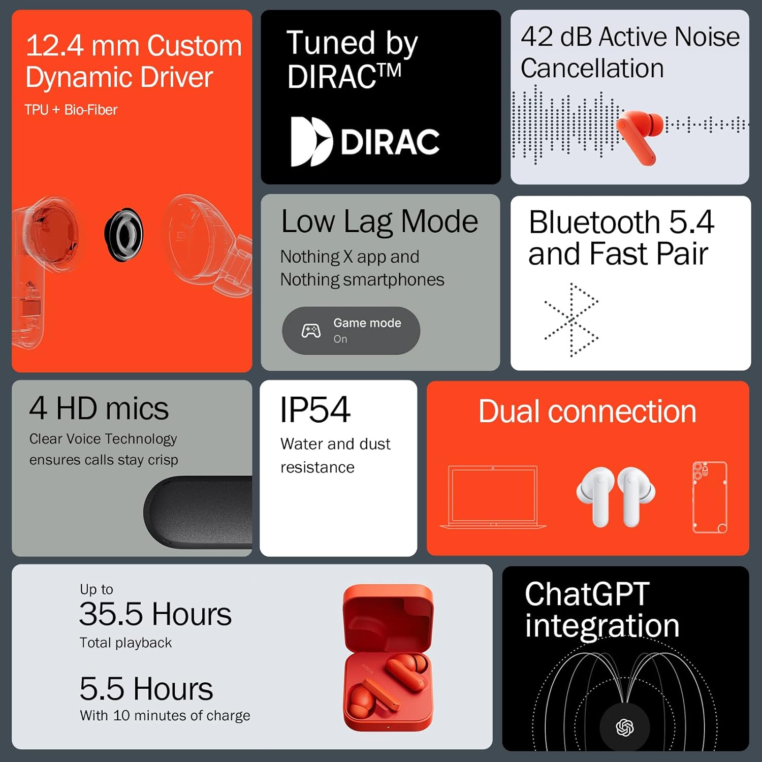 Los Buds 2a cuentan con una impresionante cancelación activa de ruido (ANC) de 42 dB, una característica que normalmente solo se encuentra en auriculares de gama alta. Gracias a esta tecnología, los auriculares son capaces de bloquear efectivamente ruidos de fondo, desde conversaciones cercanas hasta el ruido ambiental general, mejorando considerablemente la experiencia auditiva en entornos ruidosos.
