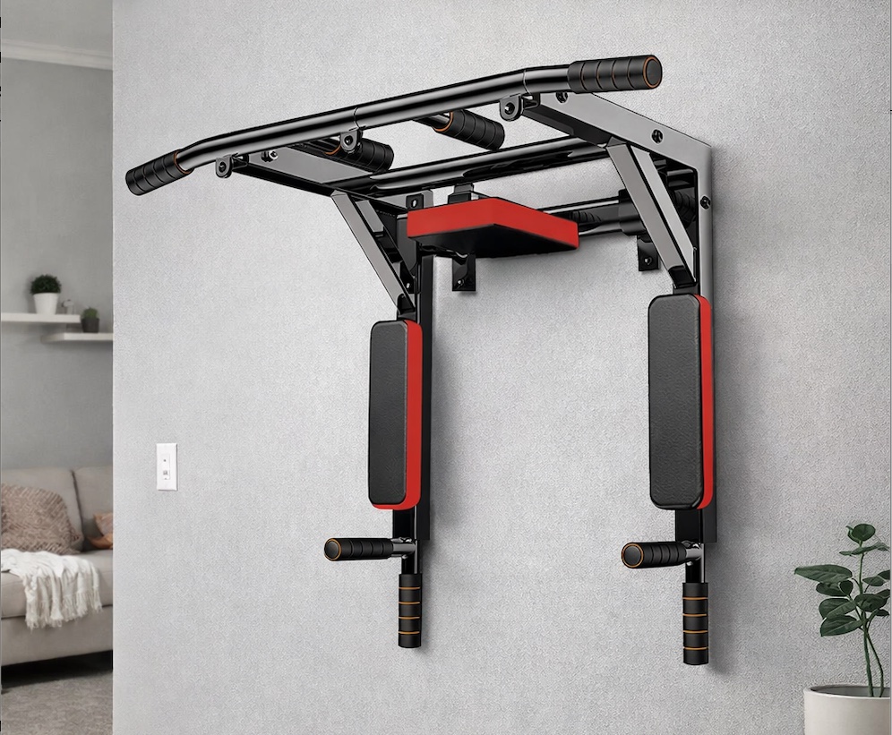 Esta barra de dominadas de pared destaca, ante todo, por su planteamiento multifunción. No se limita solo a las dominadas clásicas, sino que también incorpora apoyabrazos, respaldo y agarres inferiores para poder realizar elevaciones de piernas, fondos y distintos ejercicios de trabajo de torso. Eso la convierte en una opción bastante interesante para montar una pequeña zona de entrenamiento en casa sin necesidad de llenar la pared de accesorios distintos.