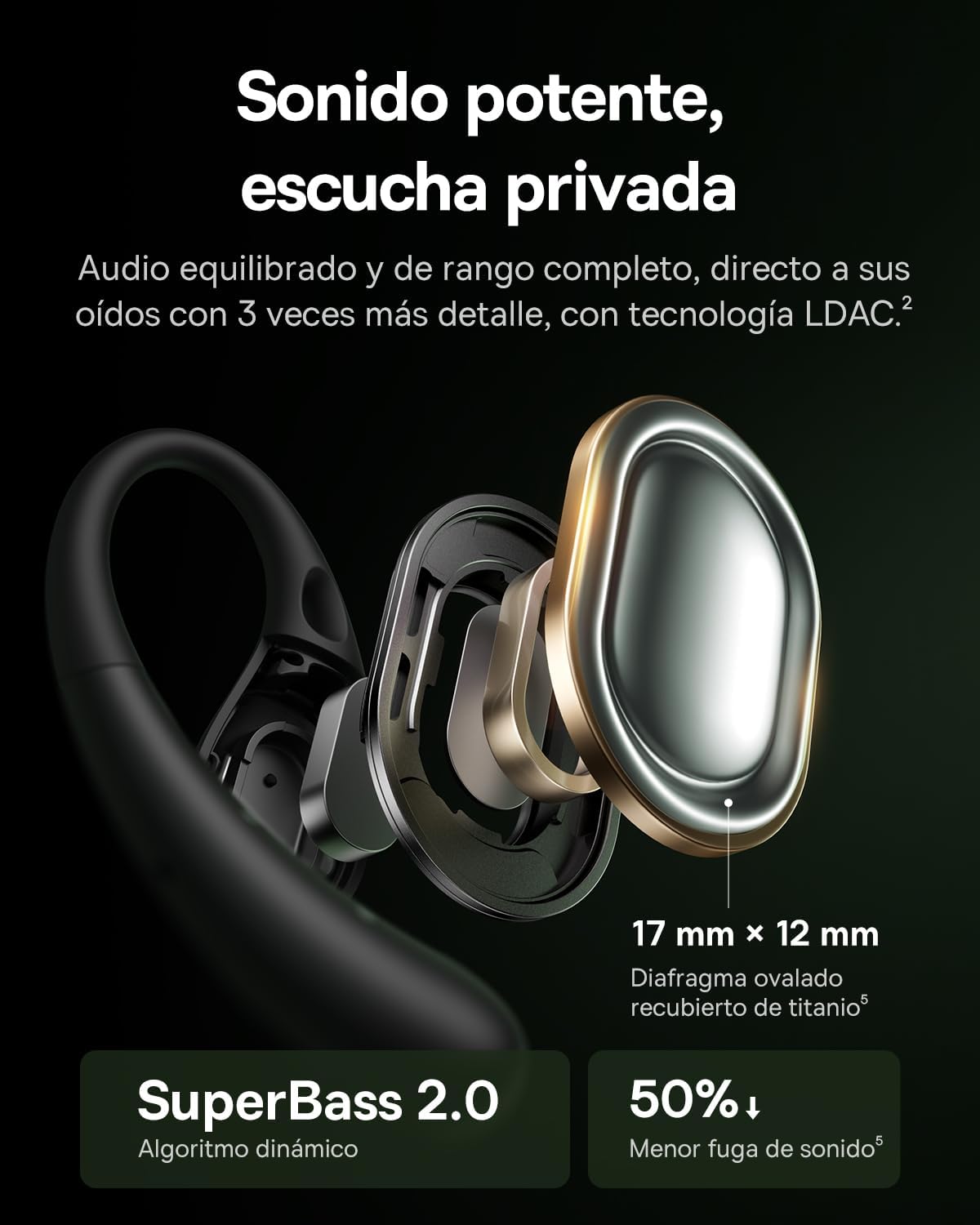 A menudo, los auriculares abiertos suelen sacrificar la profundidad del sonido; sin embargo, Baseus ha roto esta limitación. Gracias a la implementación de la tecnología Bluetooth 6.0 y el prestigioso códec LDAC, los Eli Sport 2 cuentan con certificación de alta resolución inalámbrica, siendo capaces de transmitir hasta tres veces más detalle sonoro que los códecs estándar. El núcleo de su potencia reside en sus controladores ovalados de 17×12 mm recubiertos de titanio. Estos componentes, potenciados por la tecnología SuperBass 2.0, ofrecen una respuesta de frecuencia equilibrada: graves profundos que se sienten con fuerza, medios cristalinos para las voces y agudos nítidos que no distorsionan. Es una experiencia de rango completo diseñada para motivarte en cada repetición.