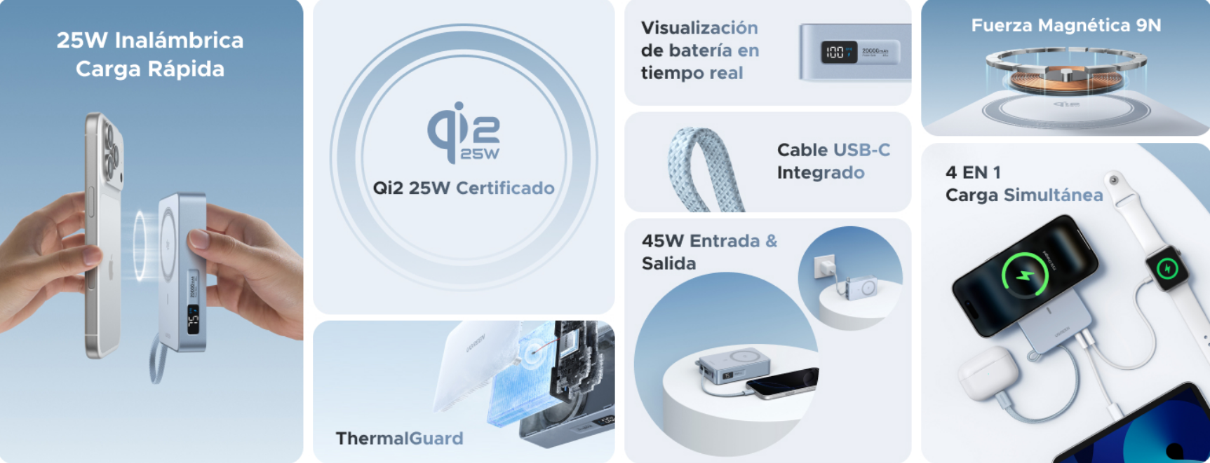 En un mundo donde los dispositivos móviles se han convertido en herramientas indispensables para trabajar, estudiar, viajar y disfrutar del ocio digital, contar con una batería externa fiable y potente es más que una comodidad: es una necesidad. La batería externa Ugreen con carga inalámbrica Qi2 de 25W y capacidad de 20000mAh se presenta como una solución de última generación, diseñada para ofrecer velocidad, versatilidad y seguridad en cada carga, convirtiéndose en la compañera ideal para quienes buscan rendimiento sin compromisos.