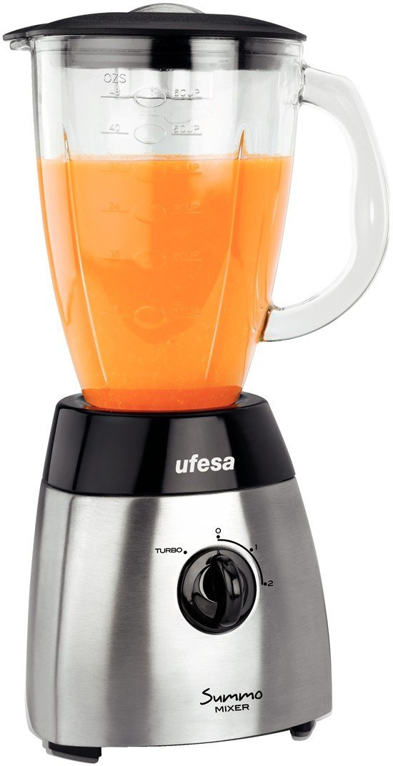 Esta batidora Ufesa tiene 500 watios de potencia y unas buenas cuchillas de corte. Dispone de un sistema de seguridad que impide que funcione salvo que la jarra se sitúe correctamente. Su jarra de vidrio de 1,5 litros de capacidad tiene cierre hermético y tapón dosificador y su cuerpo está construido en acero inoxidable.