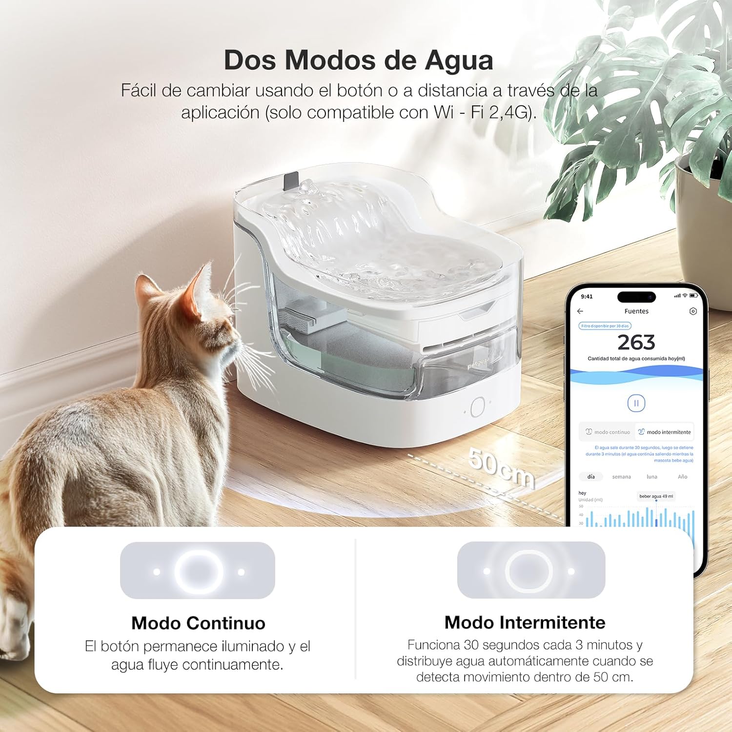 El bebedero ofrece dos modos de flujo de agua: continuo e intermitente. En el modo intermitente, el agua se activa cada tres minutos durante treinta segundos, mientras que, cuando se detecta que el gato está bebiendo, el sistema cambia automáticamente al modo continuo hasta que el animal se retira. Esta funcionalidad inteligente asegura un consumo eficiente de energía y una experiencia adaptada al comportamiento natural de la mascota.