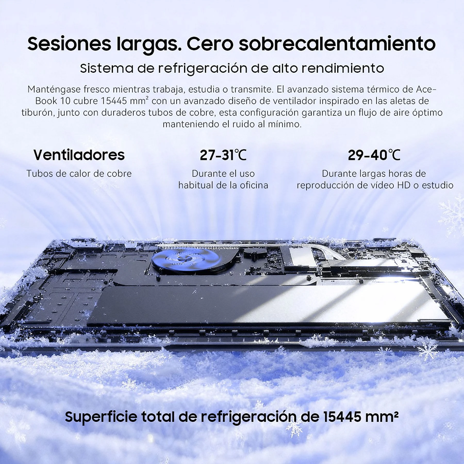 Uno de los mayores retos de un portátil de este tamaño es el calor. El Acebook 10 soluciona esto con un sistema de refrigeración inspirado en la hidrodinámica de las aletas de tiburón. Combinando un ventilador de gran diámetro con tubos de cobre de alta conductividad, el equipo se mantiene fresco y, lo más importante, silencioso, incluso cuando el procesador trabaja al máximo.