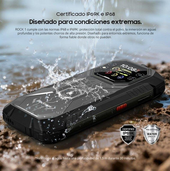 El verdadero corazón del Rock 1 es su batería de 15,000 mAh. Estamos hablando de una autonomía que puede extenderse durante días de uso intensivo, ideal para expediciones o jornadas laborales en zonas sin acceso a la red eléctrica. Su carga rápida de 33 W minimiza los tiempos de espera, mientras que la carga inversa OTG de 5 W convierte al teléfono en una batería externa capaz de dar vida a otros dispositivos en situaciones de emergencia.