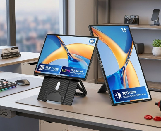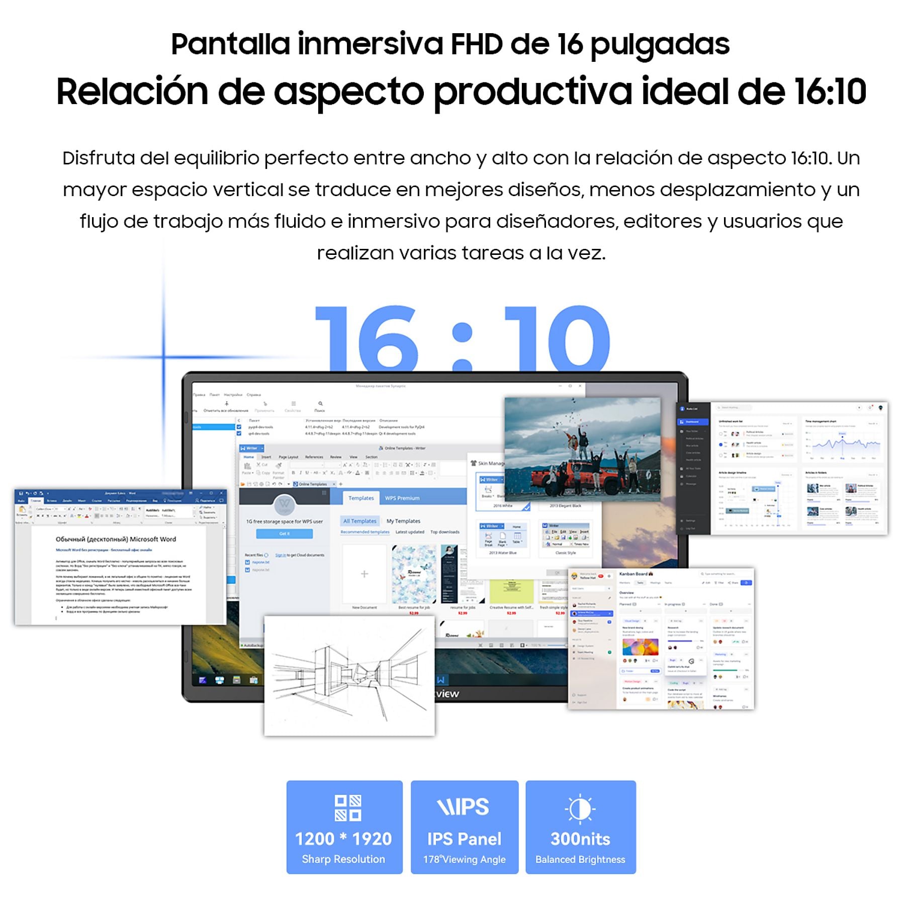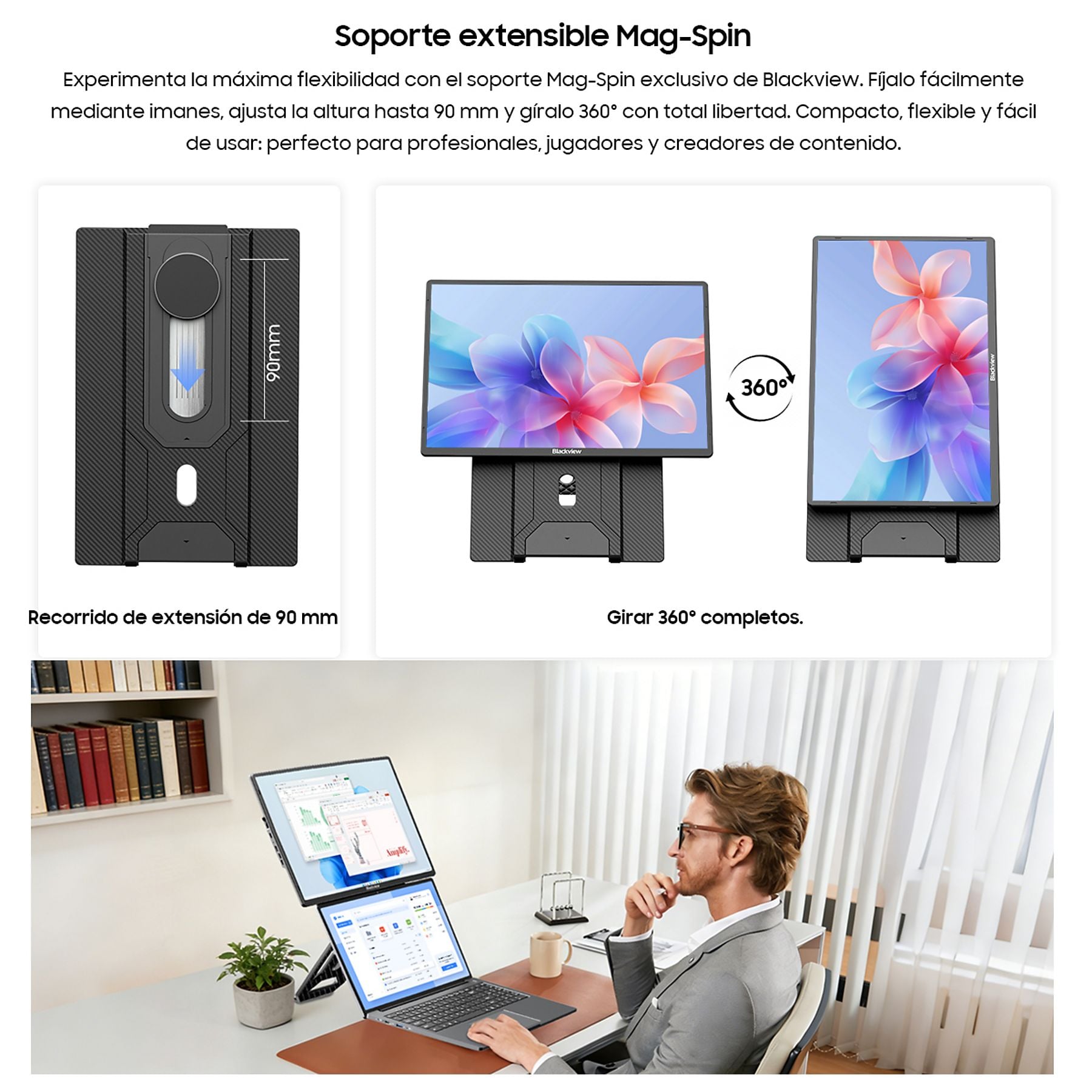 Este monitor portátil Blackview Table 9 te permite expandir tu espacio de trabajo sin sacrificar la movilidad. Con una impresionante pantalla FHD de 16 pulgadas y una relación de aspecto 16:10, este monitor portátil no solo ofrece más espacio visual, sino una experiencia inmersiva y ergonómica inigualable. Su panel IPS FHD (1920×1200) garantiza colores vibrantes y una claridad excepcional, respaldada por un amplio ángulo de visión de 178° que permite compartir contenido con facilidad sin perder fidelidad desde los costados.