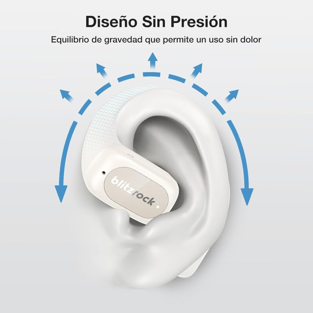 Uno de los elementos más distintivos del BlitzRock CT3 es su gancho ultrafino y ligero, pensado para ofrecer un ajuste seguro sin generar presión. Este diseño de “cero presión” se adapta con naturalidad a la forma del oído, reduciendo la incomodidad incluso tras horas de uso continuo. Equipados con controladores de 17×12 mm y tecnología de equilibrio LISO, estos auriculares ofrecen una claridad excepcional. Los agudos se perciben con delicadeza, los medios fluyen con suavidad y el conjunto genera una experiencia sonora rica y equilibrada. Además, la aplicación BlitzRock incluye un ecualizador personalizable que permite ajustar los parámetros de audio según las preferencias del usuario, adaptando el sonido a distintos géneros musicales, podcasts o llamadas. En cuanto a comunicación, los BlitzRock CT3 incorporan cancelación de ruido ENC con 4 micrófonos, lo que garantiza llamadas nítidas incluso en entornos ruidosos. Esta tecnología filtra el ruido ambiental y prioriza la voz, facilitando conversaciones claras en exteriores, oficinas abiertas o durante desplazamientos. La conectividad Bluetooth 5.4 refuerza esta experiencia, ofreciendo mayor estabilidad, menor latencia y una sincronización fluida con dispositivos móviles, tablets o portátiles.El diseño abierto de estos auriculares no solo mejora la comodidad, sino que también aporta seguridad. Al no cubrir completamente el canal auditivo, permiten mantenerse alerta al entorno: escuchar música o podcasts sin perder contacto con el tráfico, las conversaciones cercanas o las señales importantes. Esta característica los convierte en una opción ideal para quienes practican deporte al aire libre, se desplazan por la ciudad o simplemente prefieren una experiencia auditiva más consciente.