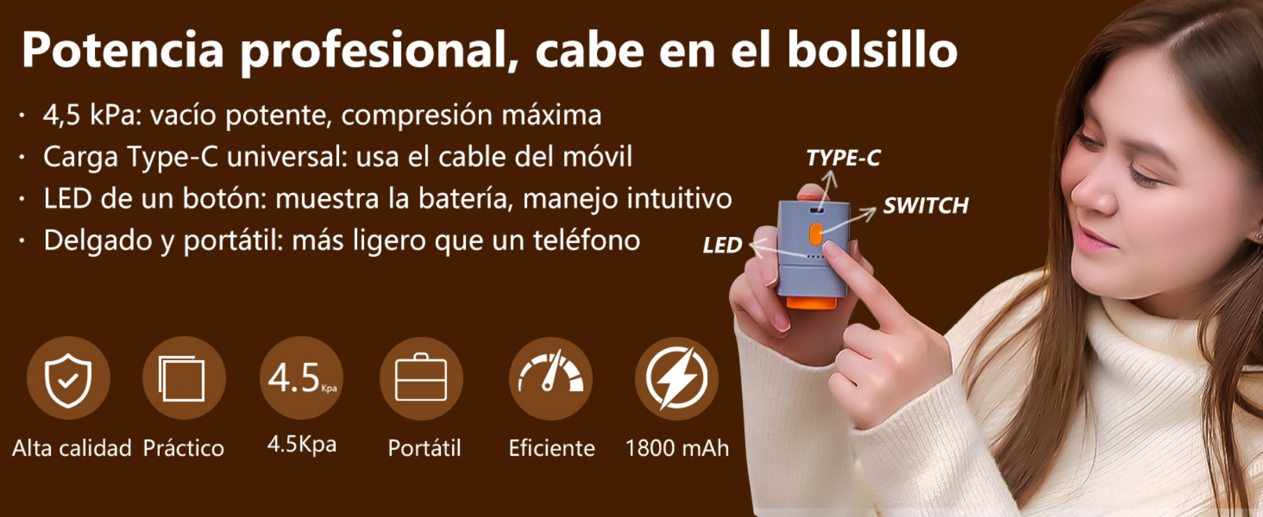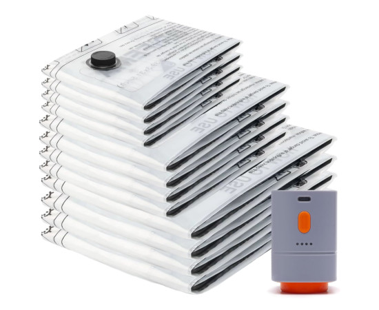 El conjunto incluye 4 bolsas pequeñas de 40×50 cm, 4 medianas de 50×70 cm y 4 grandes de 60×80 cm, cubriendo así todas las necesidades de almacenamiento: desde camisetas, ropa interior o accesorios, hasta abrigos, edredones, mantas o ropa de cama voluminosa. La bomba inalámbrica recargable añade un valor diferencial, ya que permite comprimir las bolsas en cualquier lugar sin depender de enchufes. Su funcionamiento es tan sencillo como colocarla sobre la válvula, encenderla y dejar que haga el trabajo. En apenas 10–15 segundos las bolsas pequeñas y medianas quedan completamente selladas, mientras que las grandes requieren solo 20–30 segundos. Esta rapidez convierte el proceso en algo práctico y cómodo, ideal para preparar equipaje o reorganizar el hogar sin perder tiempo.