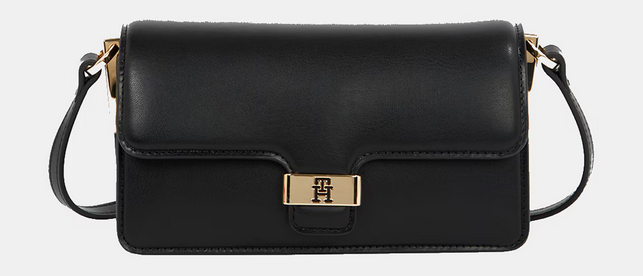 La estructura cuenta con un cierre de solapa, un elemento que aporta seguridad y un aire retro encantador. El protagonismo absoluto se lo lleva el logotipo de Tommy Hilfiger situado estratégicamente en el cierre. Este detalle metálico no solo es un sello de autenticidad, sino que actúa como el punto focal de luz sobre el fondo oscuro, elevando instantáneamente el estatus de la pieza. Gracias a su correa bandolera regulable, el bolso se ajusta a la perfección a la fisonomía de cada mujer, permitiendo llevarlo cruzado para una mayor comodidad durante el día o al hombro para un estilo más formal.