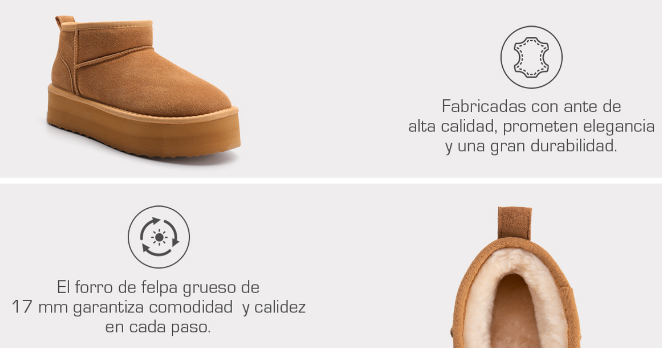 • Revestimiento de Piel Sintética: Mantiene la textura suave en contacto con el pie, reforzando la sensación térmica.