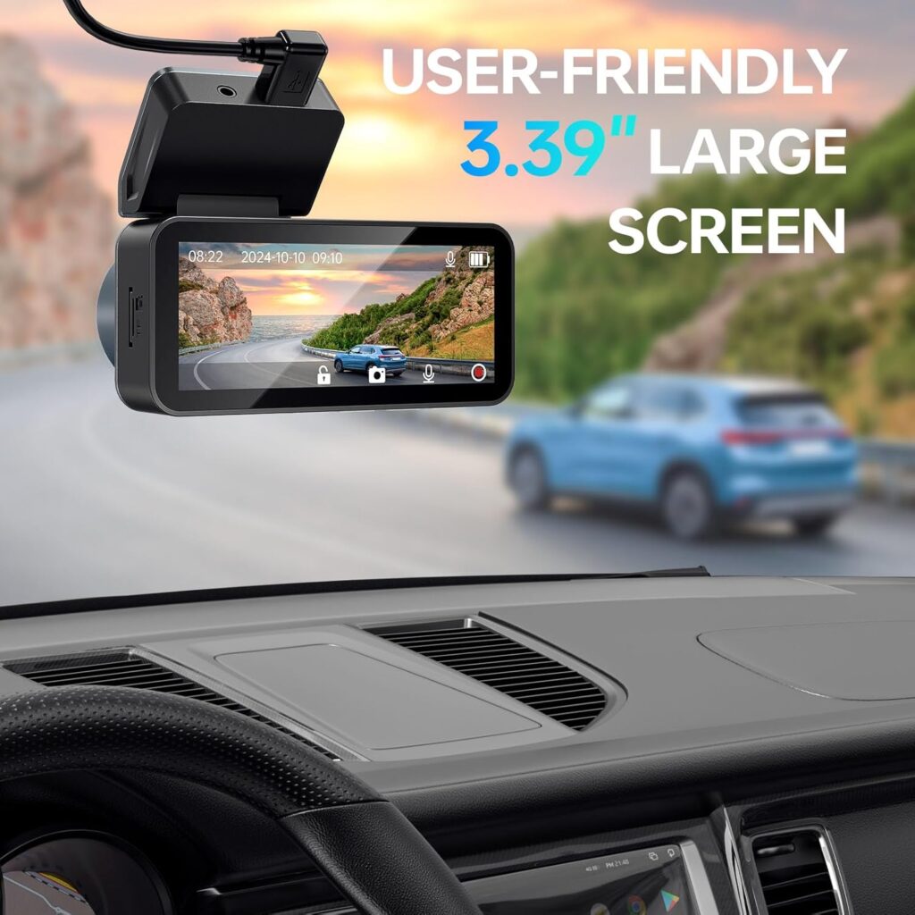 La cámara incorpora además un sensor G de alta sensibilidad y un sistema de grabación en bucle continuo, lo que garantiza que siempre haya espacio disponible para nuevos vídeos. Incluye una tarjeta microSD de 64 GB de alta velocidad, y cuando la memoria se llena, los archivos más antiguos se sobrescriben automáticamente. Sin embargo, si el sensor G detecta una vibración fuerte o una colisión, bloquea el vídeo correspondiente para evitar que se pierda. Esta combinación de grabación inteligente y protección automática convierte a la cámara en un aliado fiable para la seguridad del vehículo. Además, es compatible con tarjetas microSD de hasta 256 GB, lo que permite ampliar la capacidad según las necesidades del usuario.Otro punto destacable es su pantalla de 3,39 pulgadas, más grande que la mayoría de modelos del mercado. Esta pantalla facilita la visualización en tiempo real y la reproducción de vídeos sin necesidad de recurrir a otros dispositivos. Su sistema de montaje frontal es flexible, desmontable y muy fácil de instalar. Incluye adhesivo 3M y una base que permite ajustar el ángulo de la cámara con precisión, adaptándose a diferentes tipos de salpicaderos y preferencias de conducción.