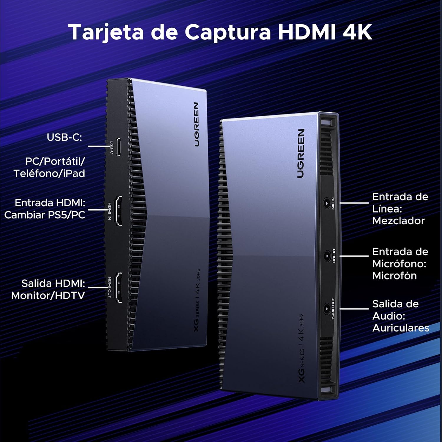 No dejes que un audio mediocre arruine una imagen excelente. Esta capturadora Ugreen incluye puertos dedicados para una gestión de sonido profesional: