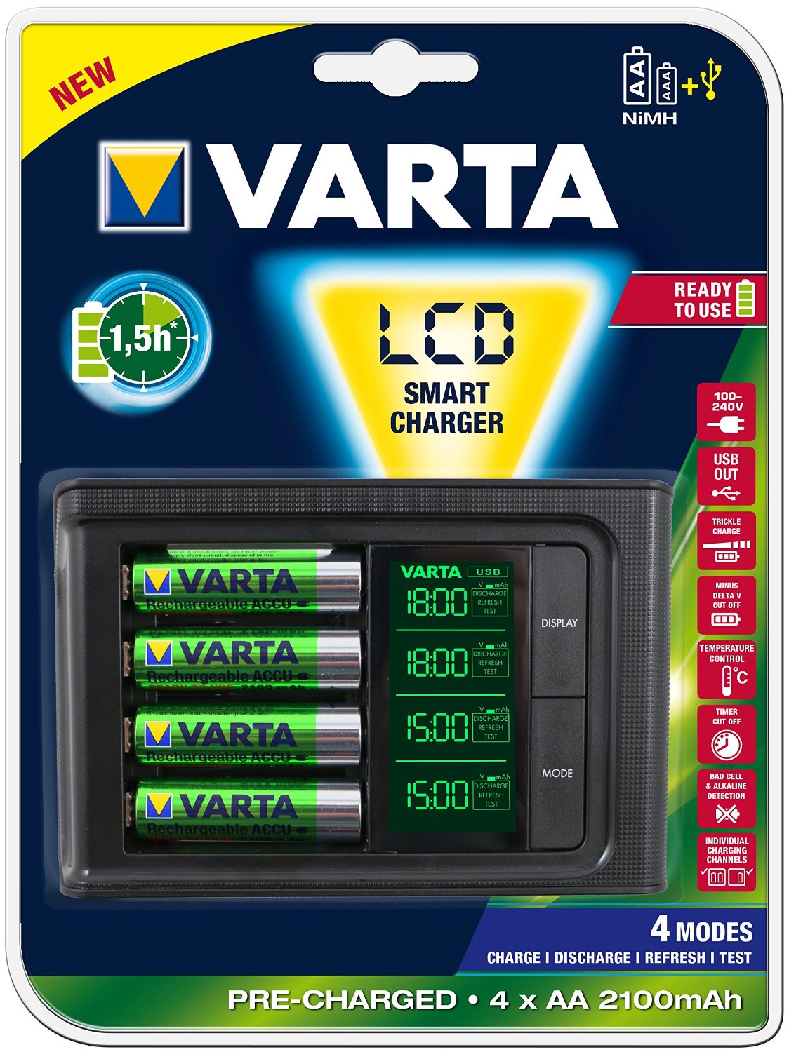 varta1Gracias a su pantalla led con este cargador Varta no sólo comprobarás el estado de tus pilas recargables AA y AAA en todo momento, tanto su voltaje como su capacidad, sino que además podrás volverle a dar vida a aquellas pilas antiguas que han quedado dañadas por el efecto memoria.