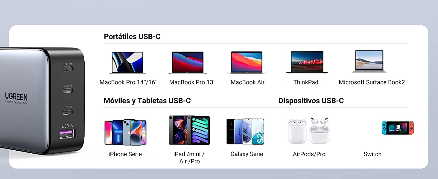 El cargador Ugreen Nexode 100W USB C es imprescindible para todas sus necesidades de carga. El cargador tiene 4 puertos:  3 puertos USB C y 1 puerto USB A  soportando una salida total de hasta 100W. Es compatible con una amplia variedad de dispositivos, desde portátiles USB C hasta teléfonos móviles, consolas portátiles como Nintendo Switch y otros dispositivos. Para garantizar la máxima potencia de salida, es importante tener en cuenta que el puerto USB C3 y el puerto USB A no se pueden utilizar simultáneamente.