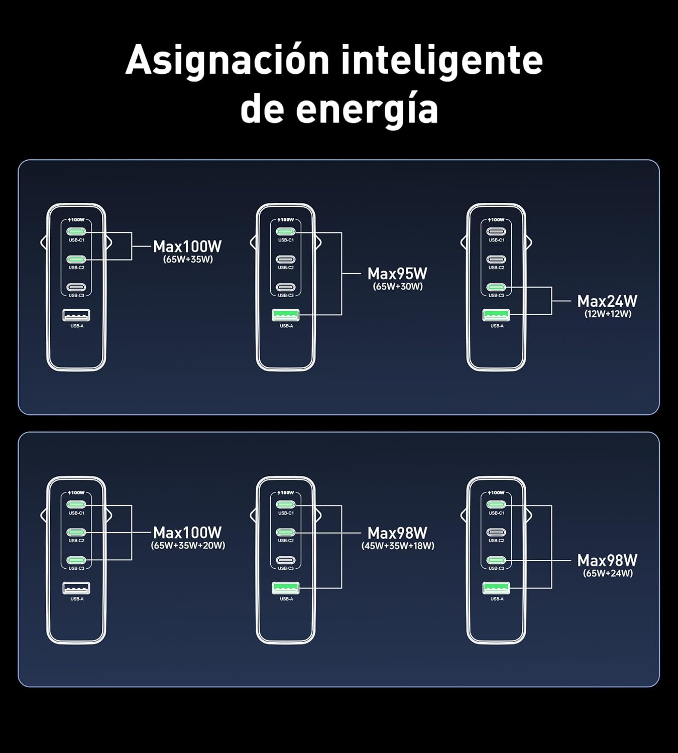 La arquitectura de este cargador ha sido optimizada para ofrecer una gestión de energía dinámica. Equipado con 3 puertos USB-C y 1 puerto USB-A, permite la carga simultánea de hasta 4 dispositivos sin sacrificar la estabilidad.