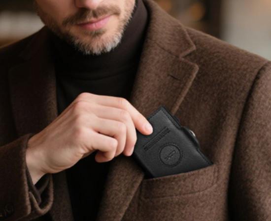 Tarjetero Pop-Up Inteligente: Un mecanismo de aluminio con capacidad para 5 o 6 tarjetas, diseñado para el acceso rápido.