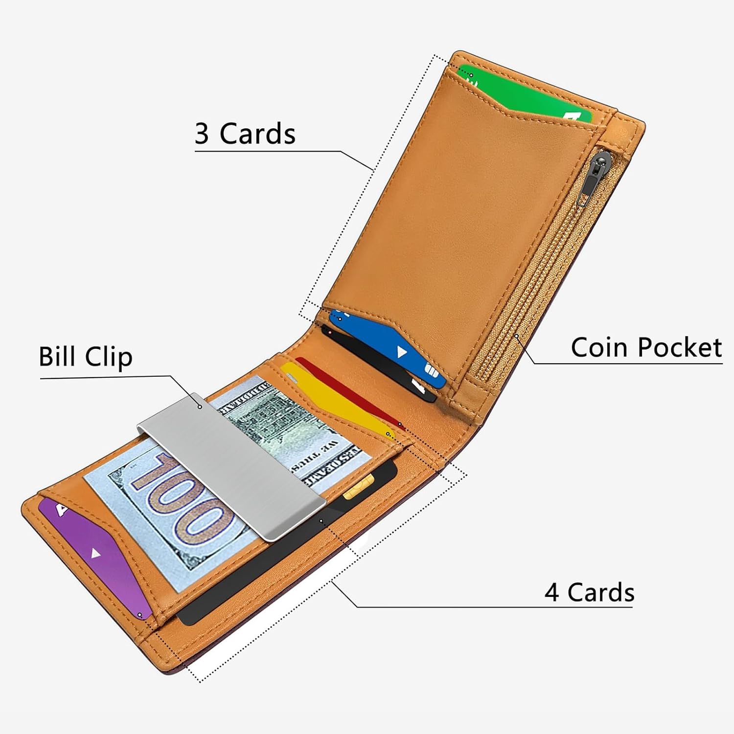 Además, incluye elementos prácticos como bolsillo para monedas, clip para billetes y tarjetero, lo que la convierte en una solución completa sin sacrificar su perfil delgado. El sistema de cierre plegable permite un acceso rápido al contenido, manteniendo al mismo tiempo una estructura firme y segura.