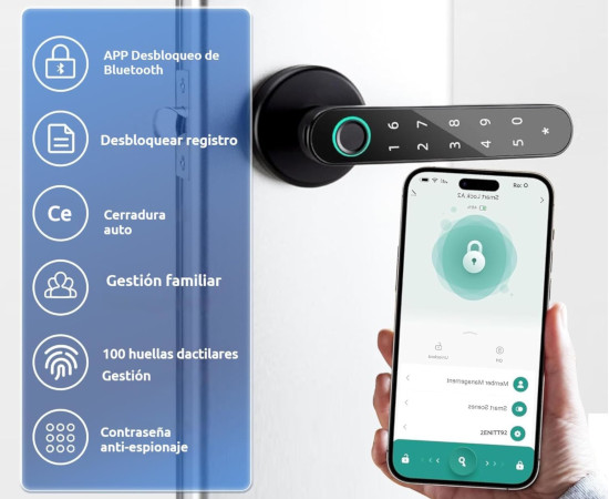El diseño ergonómico permite un acceso en un solo paso: basta con colocar el dedo sobre el sensor para desbloquear la puerta en apenas un segundo. Una vez cerrada, la cerradura se bloquea automáticamente, manteniendo tu hogar protegido en todo momento sin necesidad de recordar activar el seguro. Esta función automática es especialmente útil para familias con niños o personas que buscan máxima comodidad en su día a día.