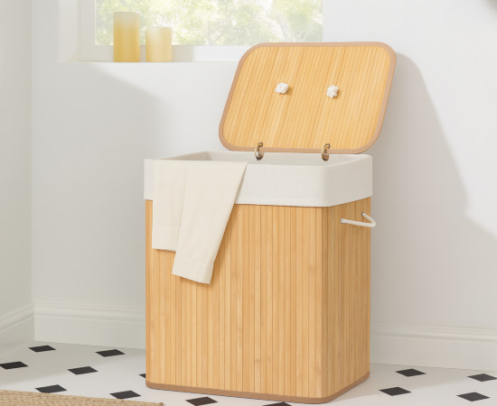 Este cesto de bambú natural destaca por su robustez y estabilidad. Las tiras de bambú de 17 mm de ancho garantizan una estructura sólida capaz de soportar hasta 20 kg de ropa, lo que lo convierte en una opción duradera y confiable. El bambú, además de ser resistente, aporta un acabado cálido y elegante que se integra fácilmente en cualquier estilo de decoración, desde ambientes modernos hasta espacios más tradicionales o naturales.