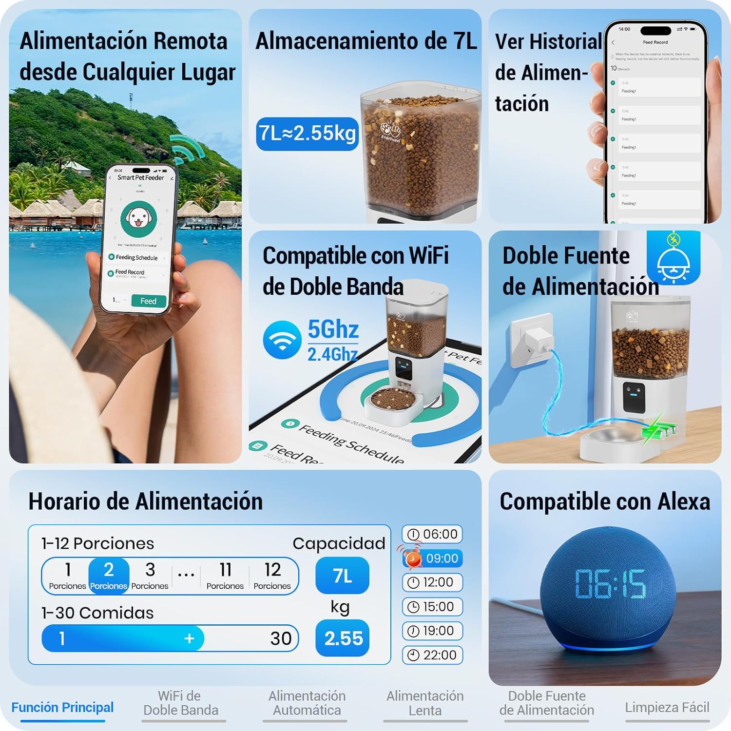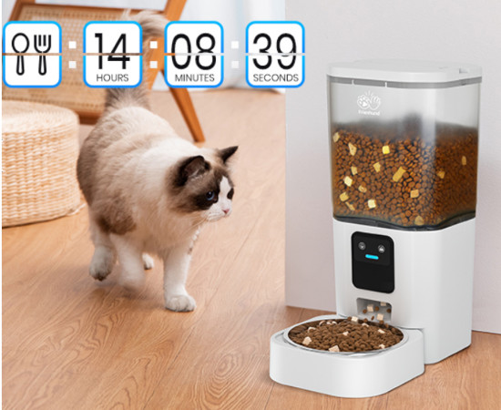 El comedero automático Frienhund incluye un contenedor de 7 litros (aproximadamente 2,55 kg), suficiente para alimentar a varios gatos o perros pequeños durante semanas. El depósito transparente de 360° permite visualizar fácilmente la cantidad de comida restante, mientras que el desecante incorporado mantiene los alimentos frescos y crujientes por más tiempo.