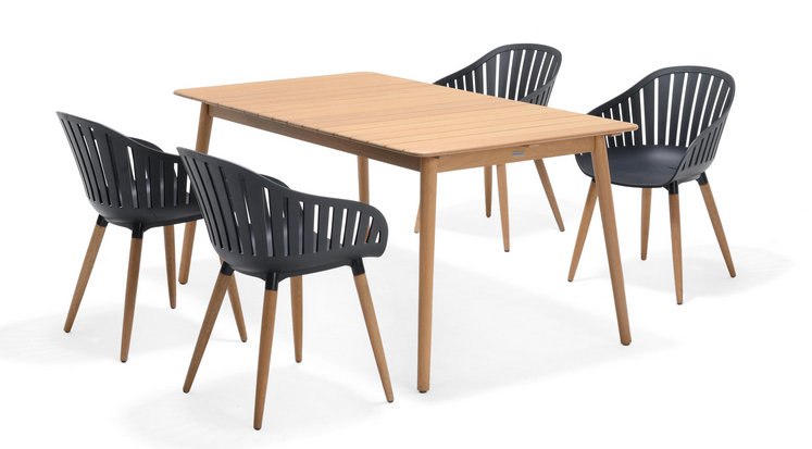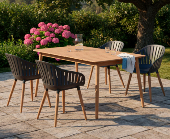 El set ha sido diseñado pensando en la comodidad del comensal y la optimización del espacio. Se compone de una mesa rectangular de 160 x 90 x 75 cm, un tamaño ideal para cenas al aire libre donde la amplitud es clave. Los cuatro sillones, con unas medidas de 69 x 57 x 47 cm, cuentan con un diseño ergonómico de respaldo ventilado que permite la circulación del aire, mejorando la sensación térmica durante los días más calurosos del verano. Invertir en el conjunto Nassau es invertir en tranquilidad a largo plazo. Gracias a la alta resistencia del polipropileno y el tratamiento de su madera, el conjunto está preparado para soportar las inclemencias del tiempo sin perder su integridad estructural ni su color. De hecho, la marca respalda esta durabilidad con una garantía de 5 años, una cifra muy superior al estándar del mercado que demuestra la confianza en la calidad de fabricación.