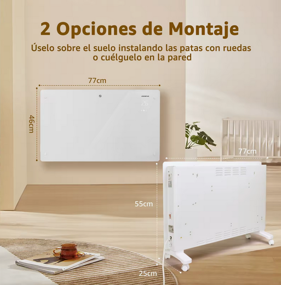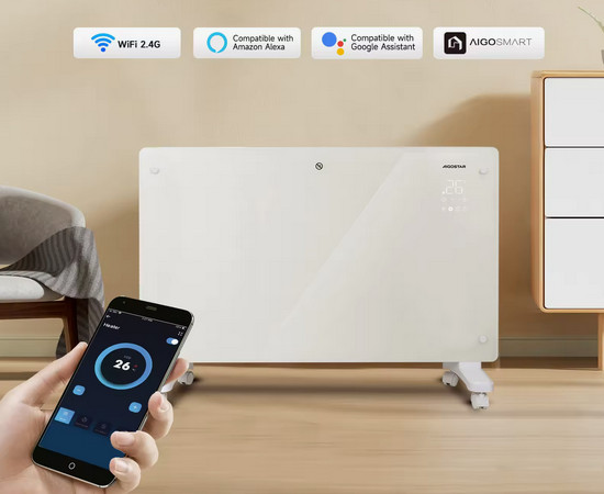 El convector eléctrico Wi‑Fi Aigostar es adecuado para climatizar estancias de hasta 20 m² con rapidez y silencio. Su diseño pensado para el hogar permite ajustar fácilmente la potencia y la temperatura, programar el horario de funcionamiento y controlarlo desde el móvil o por voz, consiguiendo un ambiente cálido y confortable sin complicaciones.