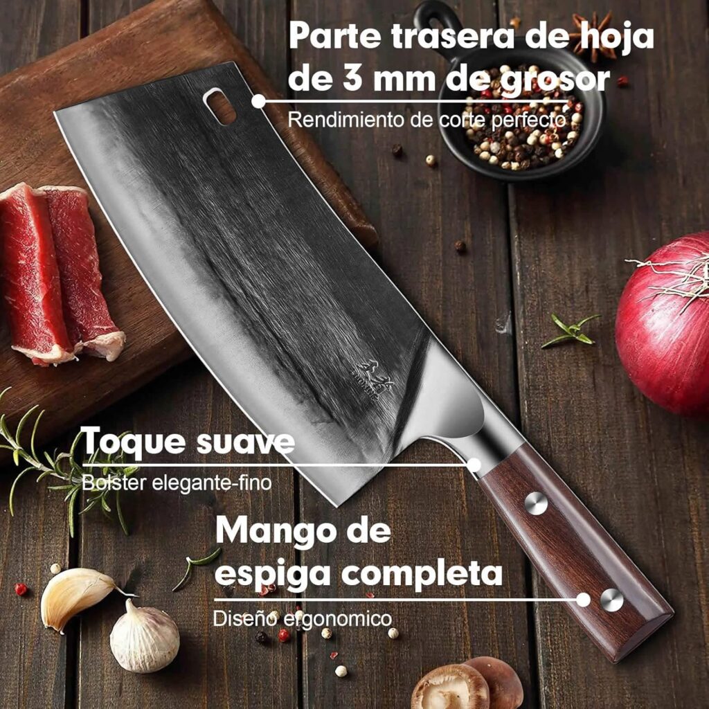 En el mundo de la cocina, la diferencia entre un plato excelente y uno mediocre reside, a menudo, en la precisión de las herramientas. Este cuchillo carnicero chino de espiga completa no es solo un utensilio; es una pieza de ingeniería forjada para quienes entienden que el corte es un ritual. Este hacha de cocina combina la herencia de la forja tradicional con las exigencias del chef moderno, ofreciendo un rendimiento que el acero inoxidable convencional simplemente no puede alcanzar.