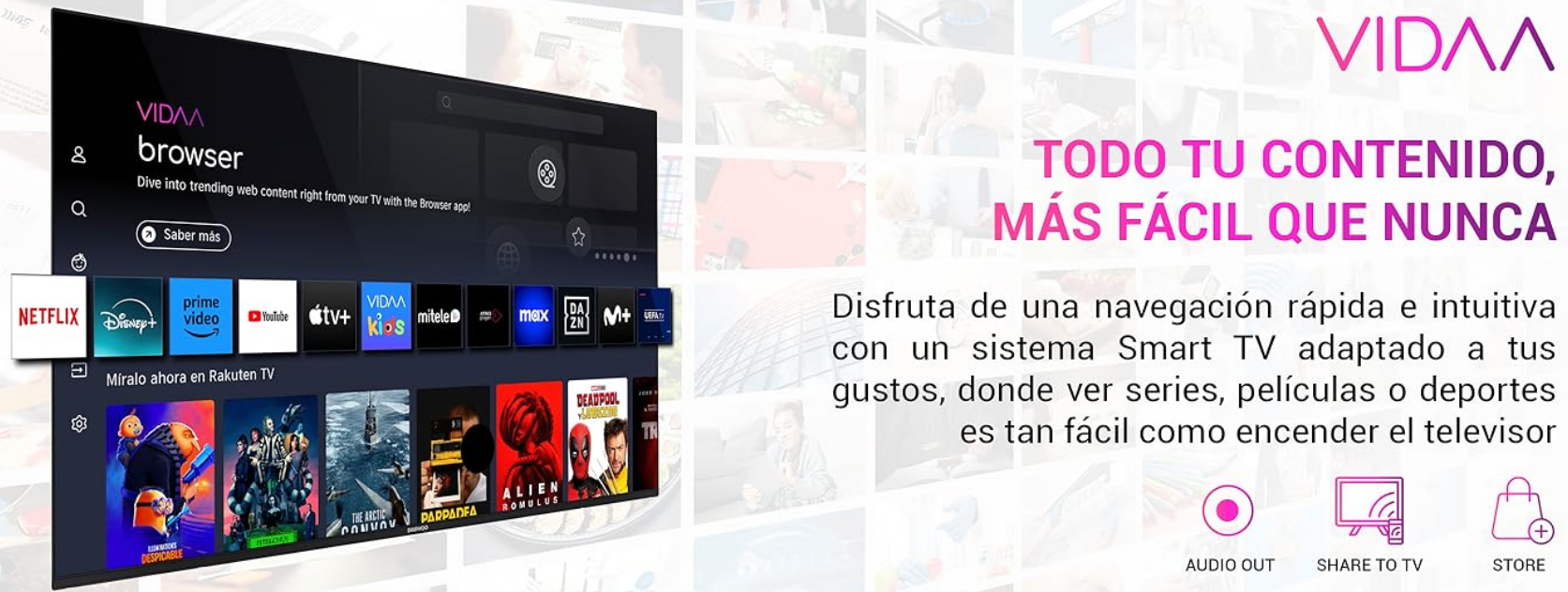 Bajo el chasis, el procesador Quad Core garantiza una navegación rápida y sin interrupciones a través del sistema operativo VIDAA. Esta plataforma está diseñada para ser intuitiva y personalizable, permitiendo el acceso directo a las aplicaciones de streaming más populares: