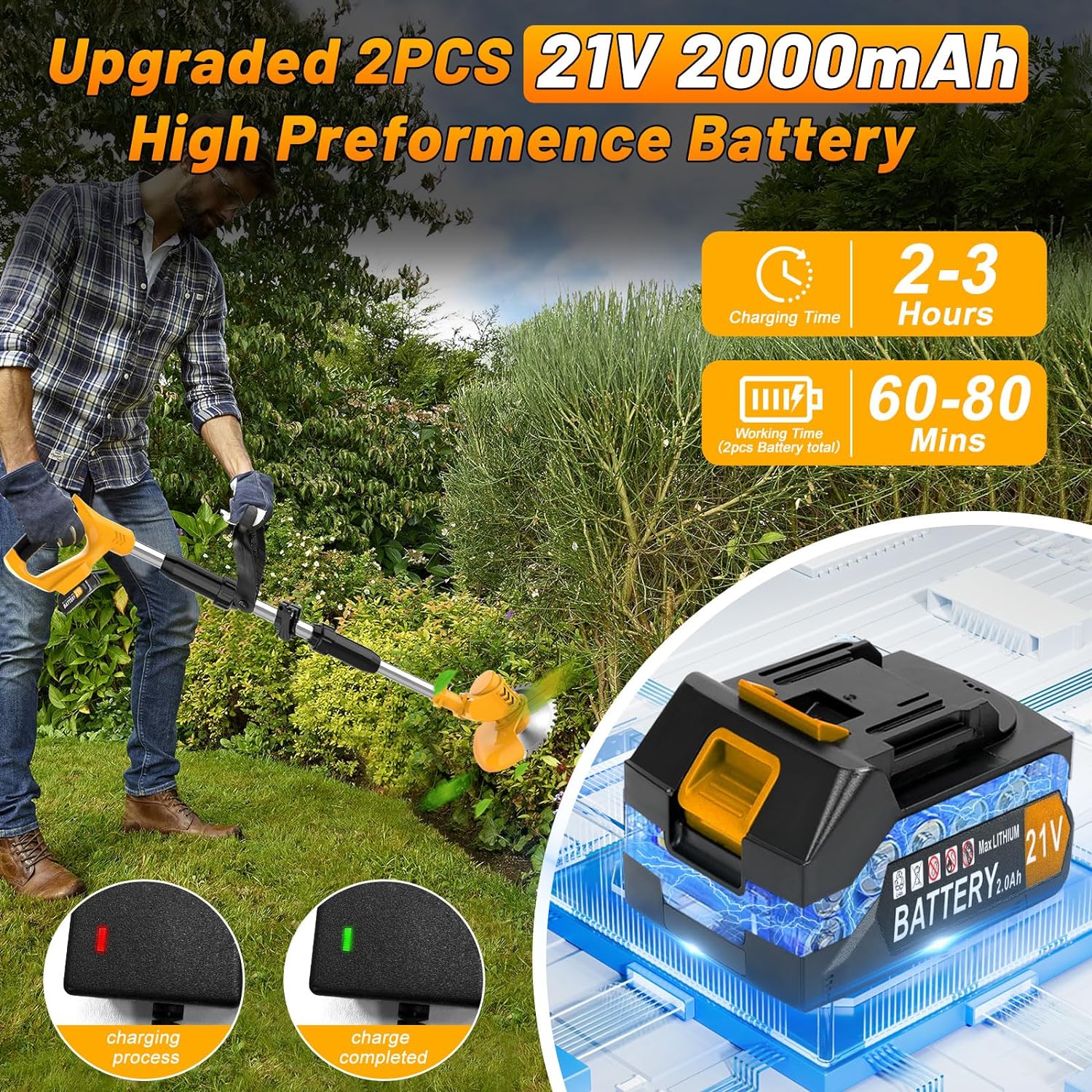 Una característica única de esta desbrozadora es su capacidad de convertirse en un cortabordes inalámbrico con ruedas. Equipada con ruedas desmontables, puede utilizarla como cortacésped o bordeadora de malas hierbas, césped y arbustos. Esta función no solo hace que desherbar sea tan fácil como caminar, sino que también mejora la eficiencia del trabajo, ahorra tiempo y esfuerzo, especialmente durante largos períodos de uso.Además, la desbrozadora eléctrica Fovendi viene con dos baterías de alta capacidad de 2000mAh y 21V, lo que proporciona una mayor eficiencia y un tiempo de funcionamiento prolongado. Con un total de 60-80 minutos de tiempo de trabajo, puede alternar entre las dos baterías para garantizar un suministro continuo de energía mientras trabaja en su jardín. Y con un tiempo de carga de solo 2-3 horas, puede volver rápidamente a su tarea sin tener que esperar mucho tiempo.