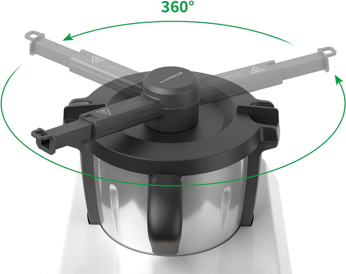A diferencia de otros accesorios rígidos, el desviador OTOmitra destaca por su versatilidad de 360°. Su instalación es tan sencilla como insertarlo en la tapa del aparato. Una vez colocado, puedes girarlo en cualquier ángulo para adaptar la salida de vapor a la configuración específica de tu cocina. Además, cuenta con un diseño extensible patentado que permite alargar el conducto hasta 60 mm. Esta característica es crucial para superar la profundidad de ciertos estantes o dirigir el vapor directamente hacia el centro de la campana, garantizando que ninguna gota de condensación afecte a tus superficies.