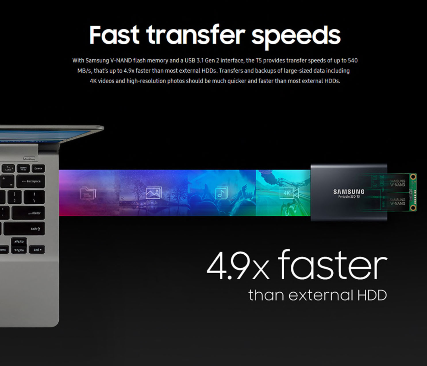 Disco duro externo Samsung T5 SSD de 500GB con puerto USB 3.1 y hardware de encriptación por 63,99€.