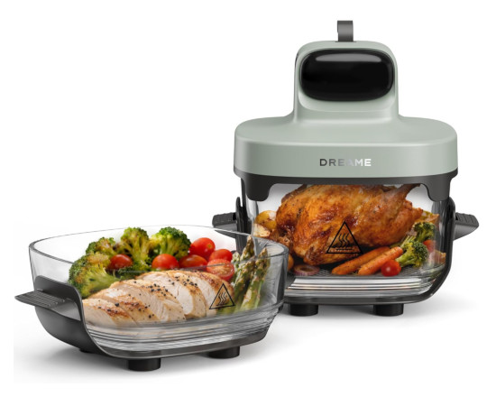 Está equipado con un recipiente de vidrio de alto borosilicato de 6 mm de grosor, un material extremadamente resistente a los choques térmicos y totalmente libre de BPA o tóxicos. Este cristal se combina con una bandeja de acero inoxidable para lograr un efecto crujiente superior. La ventaja no es solo estética: cocinar en vidrio permite supervisar el estado de los alimentos en tiempo real sin abrir la tapa, conservando mejor el calor y la energía. El secreto del sabor en el Dreame Tasti reside en su innovadora Tecnología de Aire Caliente Circulante 3D. Este sistema crea un asado envolvente dinámico que mantiene una curva de temperatura estable en todo momento.