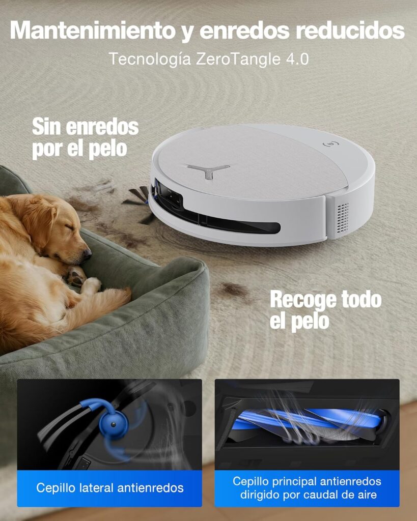 El Deebot T90 Omni ostenta una de las potencias más altas del mercado: 30.000 Pa de succión. Este caudal de aire de 16 l/s permite capturar el 100% de las partículas en alfombras y suelos duros. Para los dueños de mascotas, la tecnología ZeroTangle 4.0 es un cambio de juego. Su cepillo principal utiliza canales de flujo de aire laterales que guían el pelo directamente al depósito, evitando los tediosos enredos que suelen bloquear otros dispositivos.