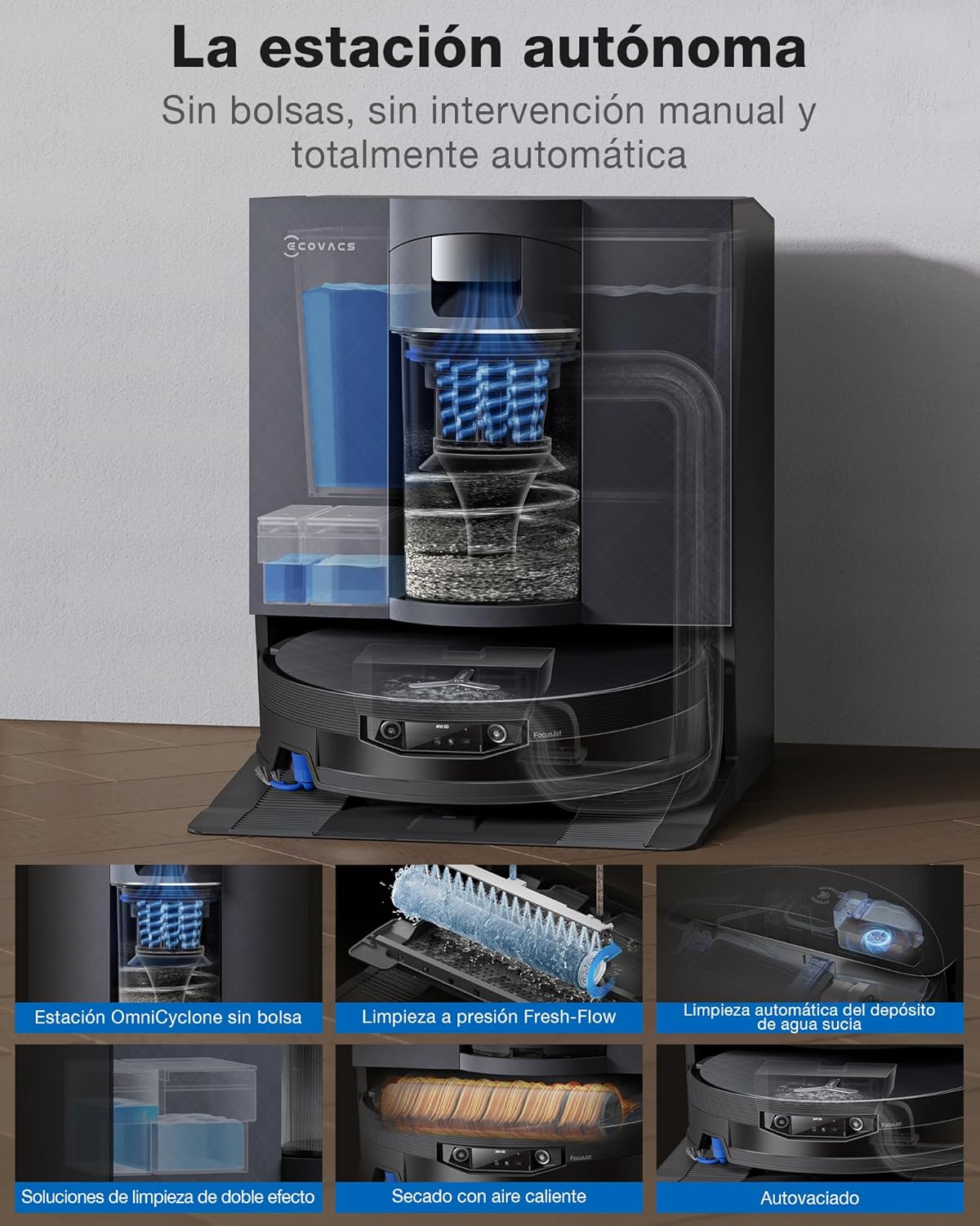 En cuanto a la autonomía, la tecnología PowerBoost Charging Plus elimina la ansiedad por la batería. Con una carga adaptable, el robot puede cubrir hasta 5.000 m² en una sola sesión. Además, su sistema de recuperación de energía es asombroso: recupera un 13 % de batería en solo 3 minutos, el tiempo exacto que tarda en autolavarse la mopa. La base de carga no solo vacía el depósito, sino que revoluciona la higiene. La tecnología PureCyclone 2.0 permite acumular residuos hasta 48 días en su contenedor de 1,6 litros, eliminando la necesidad de bolsas de polvo (ahorrando unas 25 bolsas en 5 años). La estación también incorpora: