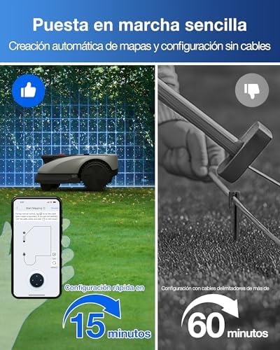 ¿Qué significa esto para ti? Que si tienes una casa con fachadas altas o un jardín frondoso, el O600 no se quedará «ciego». El sistema visual compensa las áreas de poca señal, garantizando un corte continuo y preciso en cada rincón, sin dejar parches sin segar. Uno de los mayores miedos al comprar un robot cortacésped es la instalación. Enterrar cables por todo el perímetro es una tarea tediosa que nadie quiere hacer. El Ecovacs Goat O600 elimina este problema de raíz: puedes tenerlo listo en apenas 15 minutos.