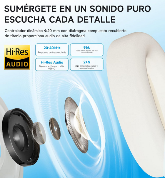 Edifier no ha escatimado en componentes. Los W800BT Pro montan controladores dinámicos de 40 mm con un diafragma recubierto de titanio. Esta elección de material no es casual: el titanio aporta una rigidez superior que minimiza la distorsión, permitiendo que las frecuencias medias y altas sean transparentes y cristalinas, mientras que los graves mantienen una pegada potente y controlada. Para los puristas del sonido, el dispositivo es compatible con Audio Hi-Res (Alta Resolución) a través de su conexión por cable USB-C. Esto significa que puedes pasar de la comodidad inalámbrica a la fidelidad absoluta del estudio con solo un gesto, capturando matices que suelen perderse en las transmisiones estándar.