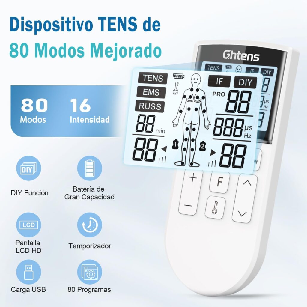 El Ghtens KTR-2640 ofrece 80 modos preestablecidos que cubren una amplia variedad de masajes y patrones de estimulación orientados a zonas como cuello, espalda, hombros, piernas y cintura. Estos programas combinan ritmos y frecuencias distintos para simular desde un masaje suave hasta una estimulación profunda. Además, dispone de 16 niveles de intensidad que permiten adaptar la experiencia desde un pulso tenue y relajante hasta una estimulación intensa y eficaz. El uso correcto requiere al menos dos electrodos para generar la corriente adecuada.