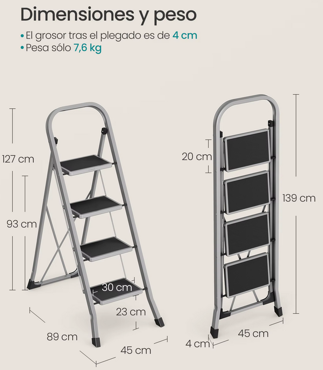 La experiencia de uso se ve reforzada por sus peldaños de gran superficie, los cuales cuentan con alfombrillas acanaladas antideslizantes. Esto asegura que cada paso sea firme, incluso si se calza calzado liso. Además, pensando en la integridad de su hogar, las patas están equipadas con tapones de goma antideslizantes que cumplen una doble función: ofrecen un agarre total al suelo para evitar deslizamientos y protegen las superficies más delicadas, como el parqué o el mármol, de posibles arañazos o marcas.