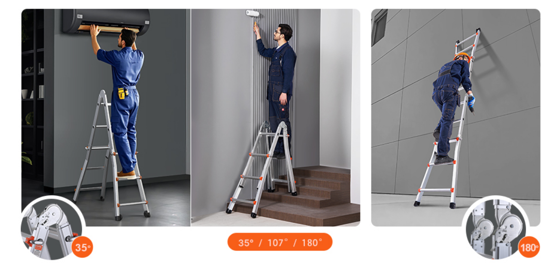 El diseño de bisagra único permite cambiar fácilmente entre tres ángulos distintos: 35°, 107° y 180°. Esta flexibilidad permite adaptarla a diferentes alturas y necesidades, desde trabajos en interiores hasta tareas en exteriores donde el terreno puede ser irregular. Además, su mecanismo de vía deslizante facilita la extensión y retracción sin necesidad de desmontar o montar piezas, ahorrando tiempo y energía en cada uso.